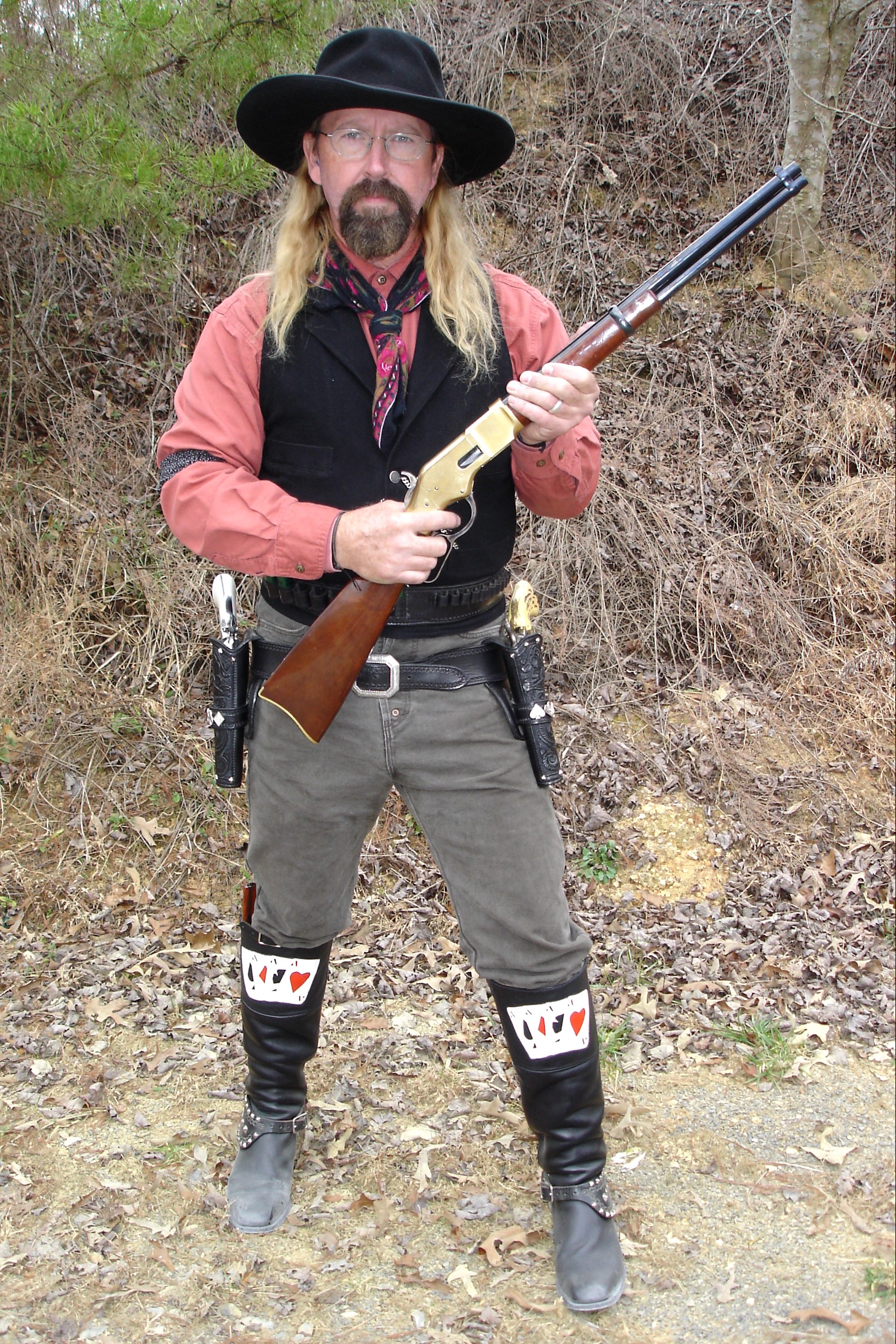 Fast Harley is tricked out to the nines, demonstrating his gunfighter image, nifty duds and classic firearms.