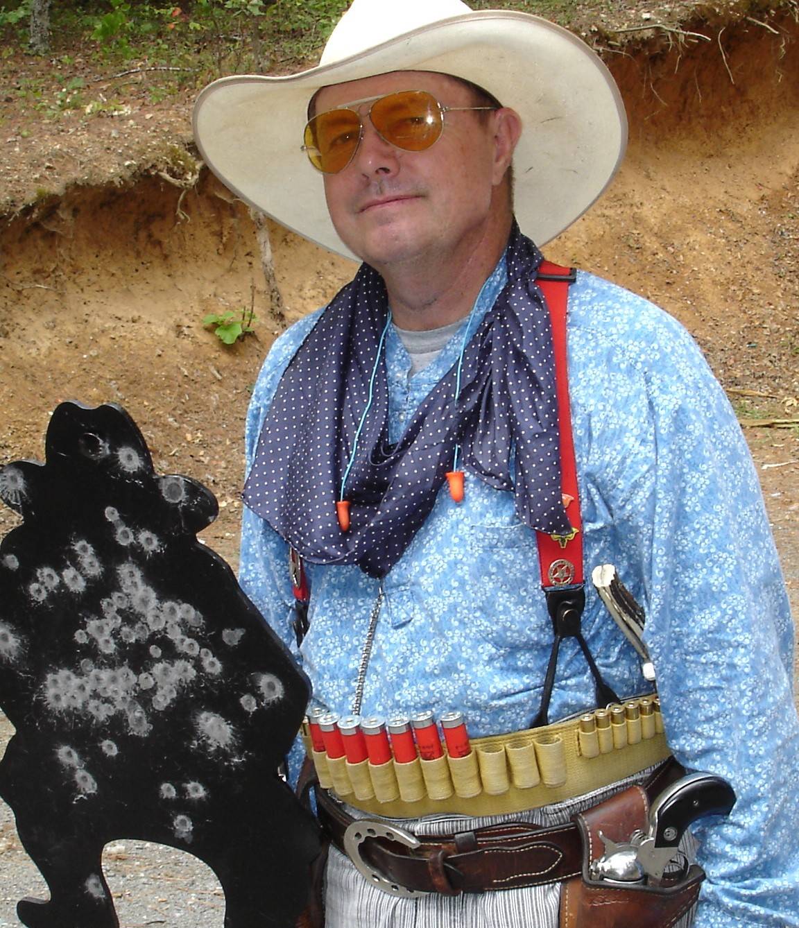 Horseshoe John, who shoots Sr. Duelist, is the Ocoee Rangers' Range Master. He's pictured here with 1 of the steel bad guys that he battles out on the range. Horseshoe John is 1 of the founders of the Ocoee Rangers.