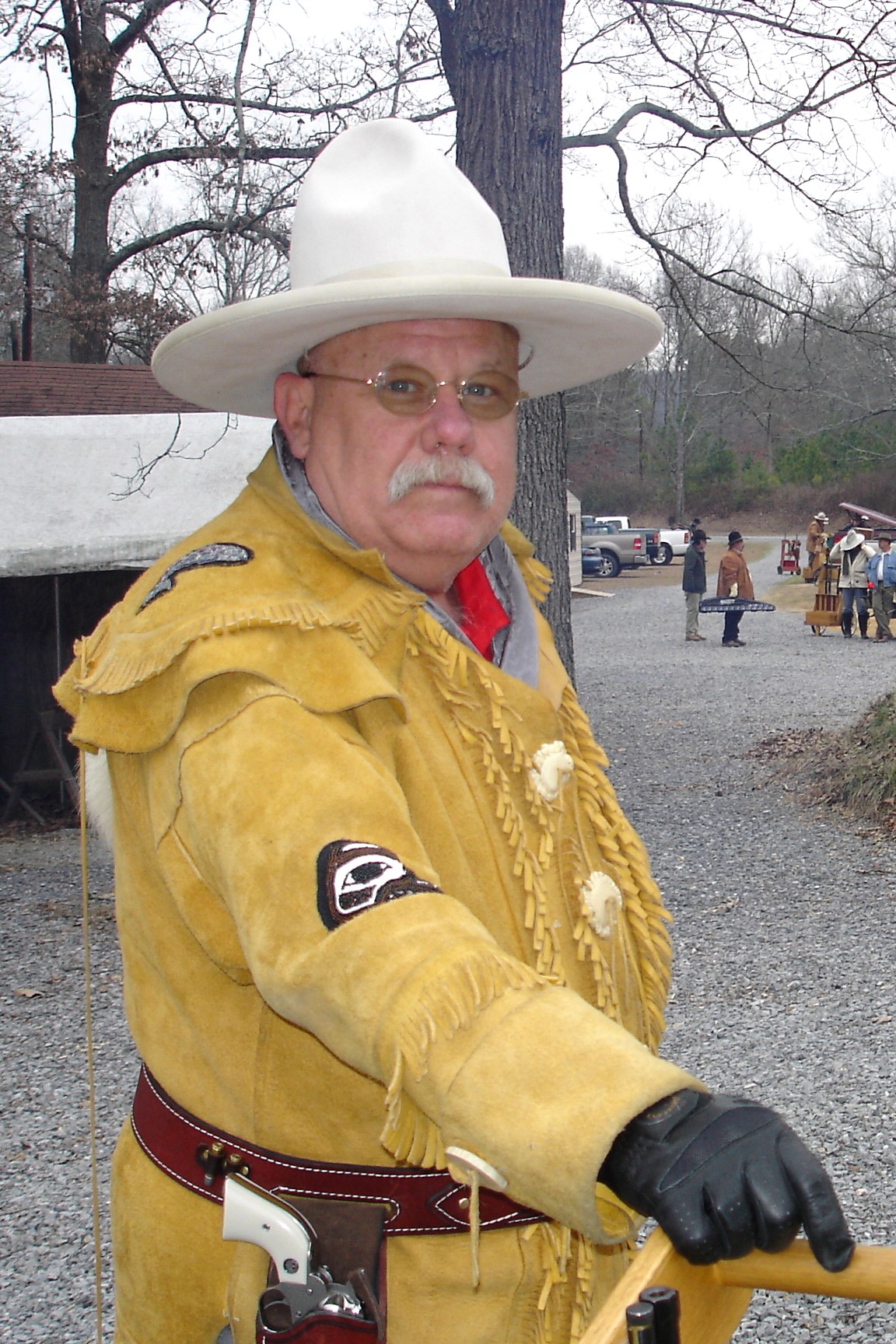 Oracle is decked out in buckskins. What can you say about Oracle that he hasn't said? That's tough. Oracle is not 1 of the strong silent type cowboys. He's a talker. And he's a black powder shooter. And he's a ROII instructer. And he has a real low SASS number. And some cowgirl would probably say that his glove doesn't match his coat. But he's a rootin' tootin' cowboy, and he doesn't care about stuff like the color of gloves.