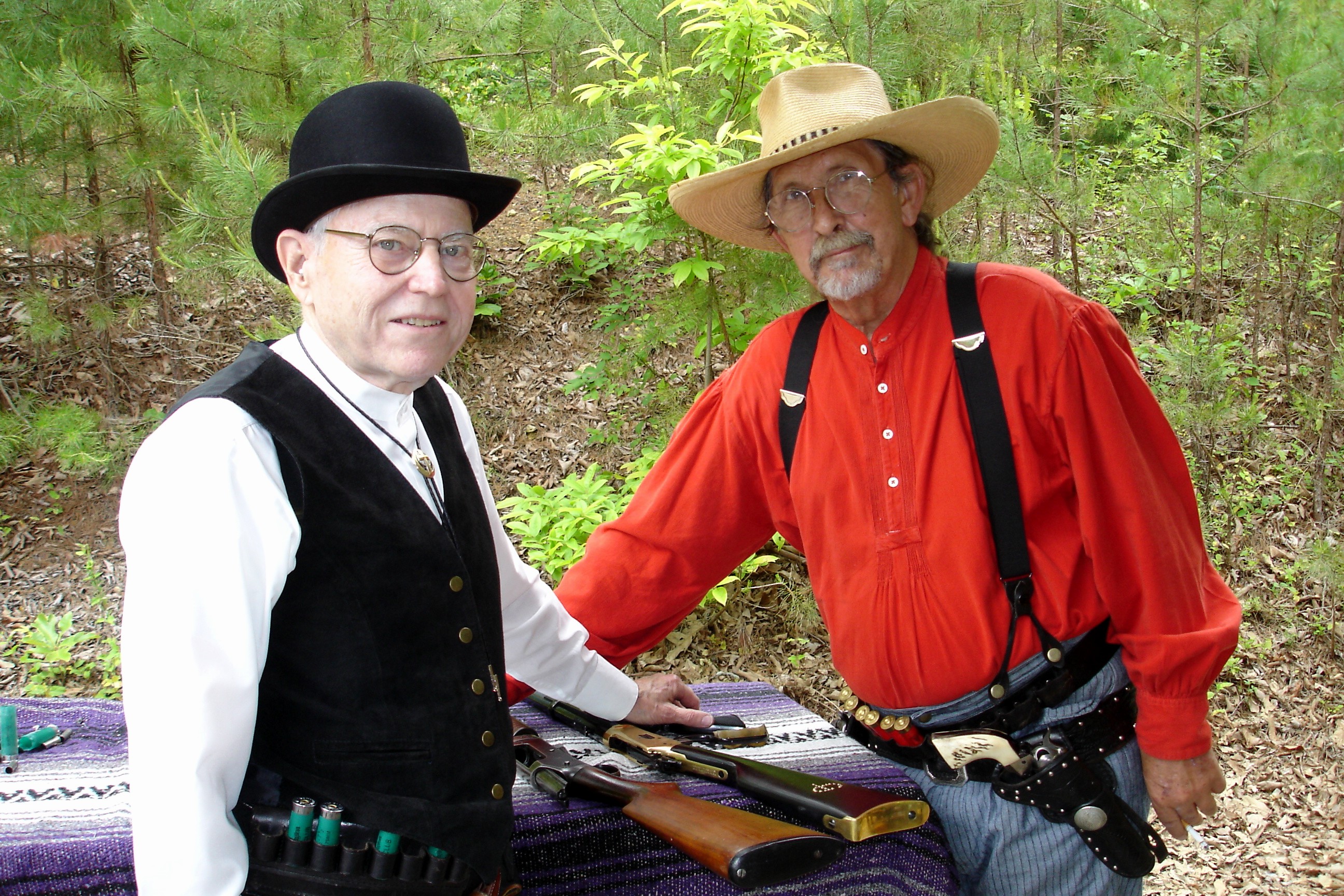 The Rev. Adam Jones (L) and Owlhoot Hardin (R) are a couple of hard shootin' cowboys. The Rev., who's a minister in real life, shoots in the Senior category. Owlhoot shoots the dirty stuff: he's a Senior Black Powder Duelist. Both are very accurate shooters.