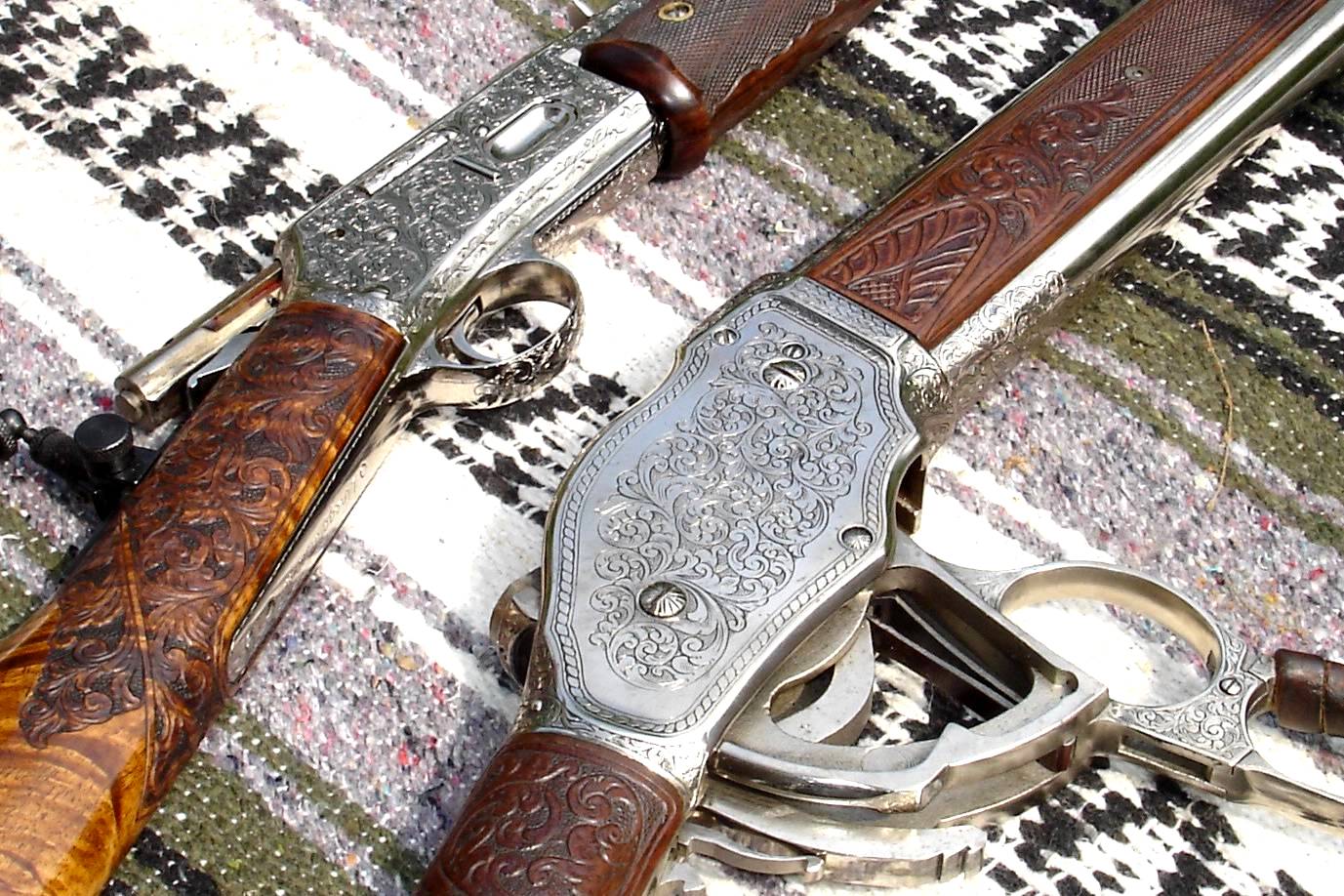 Here are a couple of Vinegarroon's long guns: a Winchester Lightning rifle and an '87 Winchester shotgun. Vinegarroon is a master engraver. These guns have been nickle plated and excellently engraved. The stocks have been carved and polished. These are outstanding examples of Vinegarroon's artistic abilities.