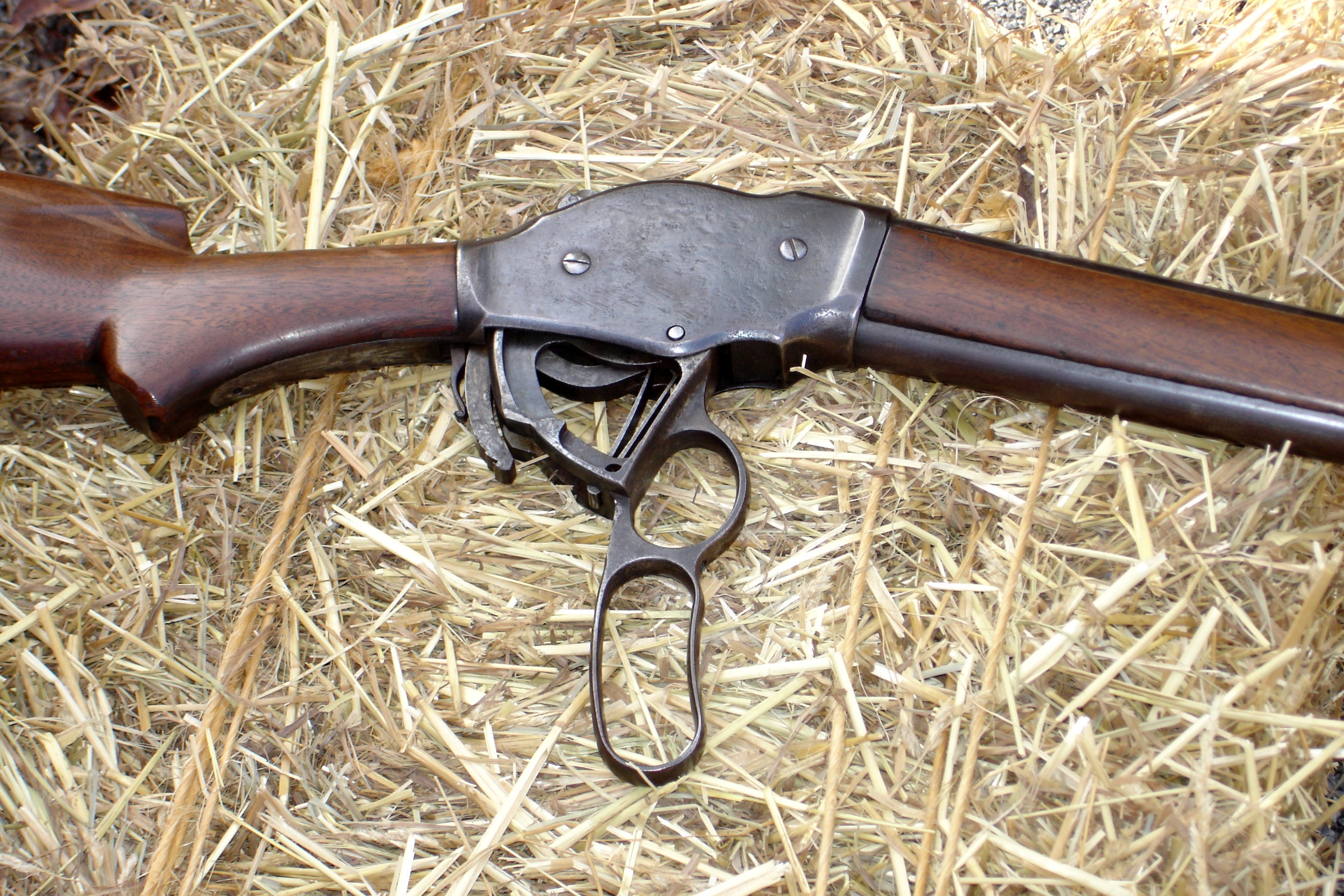 This is a real 1887 Winchester lever action shotgun, not a reproduction. At the November shoot in 2005, 1 of the stages contained a turkey shoot element and every cowboy & cowgir shot this shotgun in competition to win turkeys. This gun belongs to T-Bone Angus.