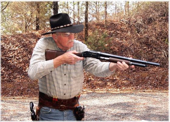 The 1st match of 2015 was chilly, and only 42 shooters showed up to shoot. But it was a beautiful day. It was sunny; the sky was brilliant blue; in the sun, the green pines really stood out against the gray trees; and in the wind, the US flag looked very striking. Another striking thing was that Marshal Too Tall shot Outlaw, one handed at waist level, and shot a No-Misses match.