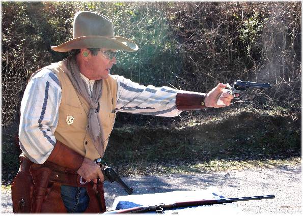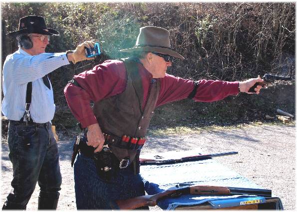 January, assuming the weather isn’t nasty, is usually 1 of our biggest shoots of the year, and 2012 continued the tradition. 83 shooters participated in the match, some who had been absent for a long time. (i.e. Curly Bill & Dustin Clays). Sheriff Donald and Deadeye Daisy also visited, but didn’t shoot. Sheriff Donald has been in poor health for a long time, but like the trooper he is, he sparkled on the range. Like always, he had a smile and friendly word for everyone who came by to say howdy. He’s always a class act, whether decked out as a cowboy or in real world clothes. It was good to see him and his shooting partner, Daisy.