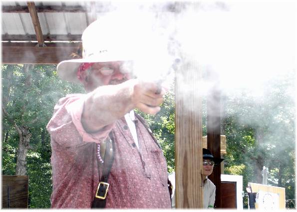 Competition for TOP GUN was a real a squeaker between Marshal W.D. and Unpleasant. But when all the smoke cleared, Unpleasant narrowly bested Marshal W.D. by 4 points. And speaking of smoke, take a gander at Kid Ziggy below. This shot is a blast from the barrel of his pistol ….. Well, really from the barrel of Jackalope’s pistol. Jackalope provided the gun and the bullets to capture this shot. We had a camera with a timer slightly down range. Ziggy asked, “What do you want me to shoot?” The answer was, “It doesn’t matter whether you hit anything or not. Just don’t shoot the camera.” He didn’t.