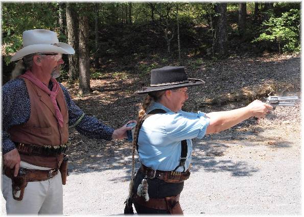 In the Old West, folks had to be self reliant, cautions, and always aware of their surroundings. Why? Well some other folks were out to feather their nests at their neighbors’ expense. Sorta like some politicians today. For example, Pat Garrett, the pistol-packer who shot Billy the Kid, later got rooked in a ranching deal. He leased his ranch for grazing and was to have received a percentage of new calves and horses born on the ranch. There was no contract saying what the lessee was going to raise. He showed up with 1,200 goats. No cattle and only the horse he was riding. What does this have to do with our shoot? Treachery. People in the old west had to watch out for it. And a 1st impression would say that Last Kiss should do the same. Look at the photo below. She’s concentrating on her targets down range. But look at Jackalope’s right hand. It appears that he’s preparing to draw his pistol. Who’d have thought he was a back shooter. And what could make him want to shoot Last Kiss? Maybe it’s because her pig tail is much longer than his pony tail. Or maybe not.