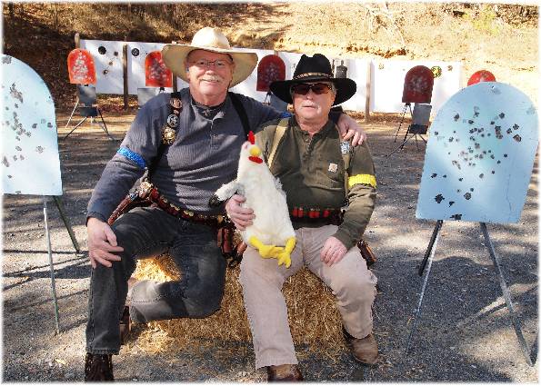 On 1 stage, a rooster was hiding behind a bale of straw. After the shooter finished shooting all the steel crazed turkeys, he / she plucked the startled rooster from behind the straw and said, “This ain’t a turkey, it’s a duck!” Of course it wasn’t a duck, it was a chicken. Even Too Tall recognized that. Some cowboys recognized it so profoundly that they wanted their pictures taken with the barn yard fowl. (How ’bout that prose, Owlhoot?)