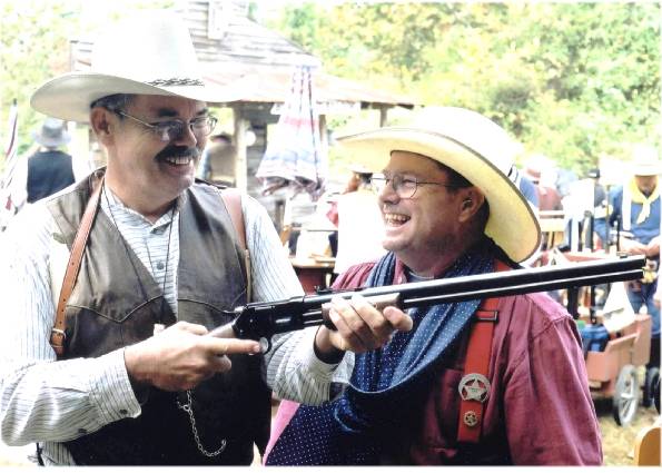Jack Rabbit Bob was a Smokey Mountain Shootist (what we then called a Knoxville Cowboy back then), was knowledgeable about guns, and usually had a big smile when amongst us. In the photo above, he’s showing Horseshoe John a Lightning Rifle. Notice the smile on his face. He moved to FL to work with a gun company to improve and introduce Lightning rifles to Cowboy shooters.